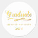 Stickers ronds Gold et White Graduation. Design par Elke Clarke © Visitez notre boutique www.zazzle.com/monogramgallery* pour plus de design et de styles. Une simple typographie de feuille d'or manuscrite écriture de police texte superposition (effet photo imprimé) avec le mot "Graduate". Ajoutez votre nom de diplômé et votre année de graduation. Parfait pour les scellés d'enveloppe sur vos annonces de remise de diplômes ou les invitations à une fête de remise de diplômes.