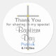 Merci Baptême Son rond autocollants. Simple croix d'argent peinte à la main avec des accents d'or contre un arrière - plan blanc. Personnalisez avec le nom de votre enfant indiqué dans un élégant script bleu, et la date en texte noir. Oeuvre et design graphiques d'origine © TamiraZDesigns.