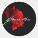 Autocollant rond montré avec un arrière - plan noir et une belle rose rouge. Texte : Merci Customiser cet article ou acheter tel quel.