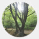 Cette belle feuille d'autocollants ronds présente une photo prise dans un bois caduque britannique. Au premier plan se trouve un grand arbre avec beaucoup de branches tordues. Le soleil brille à travers la masse de branches créant un merveilleux contraste entre l'obscurité du grand arbre et la lumière du soleil et les arbres verts de l'arrière - plan.