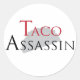 stickers Taco Assassin. Stickers avec l'expression "Taco Assassin" dans la police Trajan Roman sur la silhouette d'un taco gris. Un grand cadeau pour les amateurs de tacos, de jeux vidéo et de parodie.