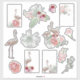 Grand ensemble de stickers tropicaux de dessins animés mignons avec des feuilles de palmiers et des flamants roses. Collecte d'autocollants, de patchs ou de broches. Les autocollants de vibes tropicales grand set.