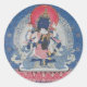 Vajrasattva et Consort Thangka ont peint 2011 par ariya entre février et mai 2011 (environ 200 heures) à Gokarn/Inde. Vajrasattva (Tib. Dorje Sempa), l'"être indestructible ou héros", est un bodhisattva dans les traditions bouddhistes de Mahayana, Mantrayana et Vajrayana. Le nom de Vajrasattva se traduit par Diamond Mind ou Thunderbolt Mind. Il est beau et paisible avec un visage doux et souriant et deux yeux, et il est assis en vajra-posture sur un disque de lune blanche et un lotus multicolore. Avec sa main droite, il embrasse sa consort, connue soit sous le nom de Vajratopa (Tib. Dorje Nyenma), soit Vajragarvi, la dame de "vajra-pride". Vajrasattva tient un vajra (dorje) à cinq branches d'or devant son coeur, et avec sa main gauche reposant sur sa cuisse, il tient une cloche argentée renversée (ghanta) au niveau de sa hanche. Dans le bouddhisme tantrique (Vajrayana), le vajra et la cloche sont utilisés dans de nombreux rites par un lama. Le dorje est un symbole masculin qui représente beaucoup de choses pour la tantrika. Le vajra est représentatif de la compassion tandis que son outil d'accompagnement, la cloche qui est un symbole féminin, dénote la sagesse. On montre des divinités tenant chacune le vajra et la cloche dans des mains séparées, symbolisant respectivement l'union des forces de sagesse et de compassion. Vajrasattva est une divinité importante d'Adi-Bouddha et de yidam, dont la pratique est particulièrement efficace pour purifier tous les souillements, en particulier ceux de la colère et de l'aversion. Sa pratique de méditation visualisée et la répétition de son mantra cent syllabe forment l'une des quatre "pratiques préliminaires" communes à toutes les écoles du bouddhisme tibétain. Mantra En plus de la pratique personnelle, le mantra Vajrasattva est considéré comme ayant la capacité de purifier le karma, d'apporter la paix et de provoquer une activité éclairée en général. Le mantra à six syllabes (OM VAJRASATTVA HUM), est une version moins formelle du mantra à cent syllabes sur lequel il est basé, mais on pense qu'il contient les points spirituels essentiels du mantra plus long.