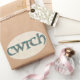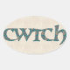 Envoyez un message gallois à vos proches ! Une feuille d'autocollants ovale avec le mot gallois 'cwtch', signifiant 'caquette' ou 'câlin' dans un script celtique, remplie d'un motif Paisley sur un arrière - plan à effet lin.