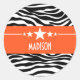 Sassy Star Zebra Stickers tendance et moderne, avec un arrière - plan zèbre noir et blanc chic et une bordure orange audacieuse ornée d'un motif étoilé amusant. Ce design girly peut être customisé avec le texte personnalisé de votre choix. Cliquez sur "Customiser" pour trouver d'autres options de personnalisation.