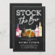 Des invitations à des soirées de fiançailles avec un arrière - plan en tableau noir, une sélection de bières et de vins en aquarelle, le dicton "stock le bar" et un modèle texte moderne facile à personnaliser.