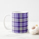 Tasse à café avec le tartan du district pour la zone administrative écossaise de Strathclyde, Écosse. Motif écossais traditionnel en plaid dans les tons violet, bleu et blanc.