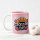 This mug features a pretty Croissant Day image. There is a cute digital illustration of a croissant and red strawberries on a pink background. The text CROISSANT DAY is written in lavender gradient letters with a black shadow effect. Above the text is an illustration of a golden-brown croissant with four strawberries. Croissant Day is celebrated on January 30th. The mug is a pink and white two-tone mug. The mug has a pink interior glaze. The mug is an eleven ounce mug. The mug is microwave and dishwasher safe.