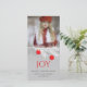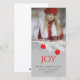 Jolie carte photo de Noël faite dans un look vertical, avec la zone d'image, sur la moitié supérieure de la carte. La moitié inférieure de la carte est décorée avec des graphiques d'une branche de pin blanc avec des ornements rouges contre un arrière - plan gris avec un accent de parties scintillant de couleur argent. Joy en grand texte rouge et texte gris foncé personnalisé en dessous, est prêt à personnaliser. Photo du modèle de Lori Lang.