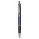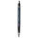 Stylo bleu promotionnel avec votre nom ou la marque de votre entreprise dans une écriture signature chic blanche et votre texte supplémentaire en lettrage moderne simple blanc.