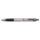Stylo élégant avec un motif géométrique coloré sur le corps. Parties noires et argentées contrastées, vues de face et de dessous sur un fond blanc.
