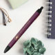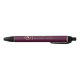 This real estate branded ink pen features a faux gold house logo framed by a circular Greek key motif on the left and simple, gold-colored sans serif text on the right, with a vertical line between, on a burgundy red background.