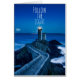 Phare au crépuscule qui clignote son phare dans la mer. Les mots "Suivez la Lumière" sont écrits en blanc.