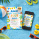 💦☀️ Make waves with this bright and playful “Splash into Four” Pool or Beach Party Birthday Invitation — perfect for celebrating your little guy’s fourth birthday in fun, sunny style! Featuring cheerful watercolor beach elements like rubber ducks, shark and duck pool floats, palm trees, a smiling sun, and colorful bunting, this design is bursting with vibrant summer colors including aqua blue, sky blue, leafy green, sunshine yellow, and bright orange.