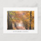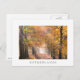 Carte postale des rayons de lumière créés par les rayons de soleil à travers le feuillage d'automne des arbres le long d'un chemin à travers une forêt dans le brouillard matinal en automne avec une bordure blanche et le texte : 'Pays-Bas'.