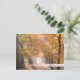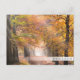 Carte postale des rayons de lumière créés par les rayons de soleil à travers le feuillage d'automne des arbres le long d'un chemin à travers une forêt le matin brouillard en automne avec une barre de décoloration et le texte : 'Holland'.