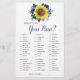 Cette carte de jeu de douche nuptiale est Qu'y a-t-il dans votre sac à main? Le design comprend des tournesols aquarelles et des fleurs bleues avec du feuillage. Personnalisez le dos des cartes avec le nom de la mariée. Produits correspondants disponibles.