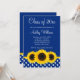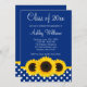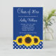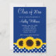 De beaux tournesols jaunes avec un motif à pois bleu et blanc sont présentés sur l'invitation à la remise des diplômes à thème du pays. Parfait pour un baccalauréat, un baccalauréat ou une invitation à une fête de remise de diplômes.