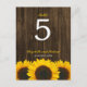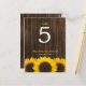 Numéro de table mariage à thème champêtre avec des tournesols jaunes sur un arrière - plan rustique en bois de grange brun foncé. Modifiez le numéro de chaque table dont vous avez besoin et ajoutez-en un à la fois à votre panier.