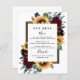 Le design présente d'élégants roses d'aquarelle, des pivoines, des fleurs sauvages et des tournesols dans différentes nuances de rouge bordeaux, bleu marine et plus sur une couronne de verdure d'eucalyptus. Le design comprend également un cadre en bois de grange sous la couronne. Une disposition de police unique complète le design général. Vous pouvez modifier la couleur arrière - plan sur l'avant et l'arrière en fonction de la couleur de votre choix ou laisser les deux sur le blanc. Visualisez la collection sur cette page pour trouver les produits de papeterie mariages correspondants.