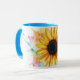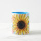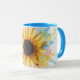 This floral mug features my original photograph of a sunflower. I processed my photograph with a watercolor painterly style and colorful splash for an artsy flair. The handle and inside of the cup are aqua blue to complement the artwork.