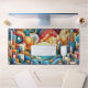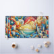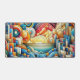 A textured artwork of an abstract colorful city with the sun rising