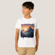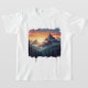 This stunning T-shirt design features a breathtaking sunset over majestic mountain peaks, surrounded by deep green pine forests. Warm golden sunlight radiates across the sky, blending beautifully with dramatic clouds and layered mountain silhouettes. The artistic paint-splash effect adds a modern, creative touch, making it perfect for nature lovers, hikers, adventurers, and outdoor enthusiasts.