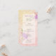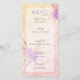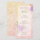 This menu has a sheer vellum-like layer over lovely romantic floral bouquets and sheer blush chic Coquette bows. Set on a warm painterly rose garden lace.