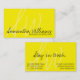 Faites une première impression fantastique avec ces cartes de visite chic jaune soleil. Ces cartes de visite ont un arrière - plan jaune solide. Ils disposent d'une police de script manuscrite avec vos initiales en jaune plus clair sur l'arrière - plan. Sur le devant, il y a de la place pour votre nom et votre titre. Au verso, il indique "Restez en contact" et permet de disposer de six lignes d'informations de contact telles qu'un numéro de téléphone, un numéro de téléphone portable, un numéro de fax, une adresse e-mail, des poignées de médias sociaux, votre site Web ou toute autre méthode de contact que vos connexions d'affaires utilisent. Il s'agit d'un style de carte de visite générique qui peut être utilisé pour presque n'importe quel type d'entreprise tels que les consultants, les graphistes, les entrepreneurs, les agents immobiliers, les cosmétologues, les coiffeurs, les avocats et des milliers d'autres professions et titres d'emploi.
