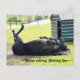 Une carte postale avec la photo d'un magnifique cheval noir qui roule dans le sable, s'amusant.