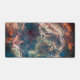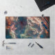 La supernova reste Cassiopeia A (Cas A), située à 11 000 années-lumière de la Terre dans la constellation Cassiopeia. L'image affiche des couleurs vives et des structures complexes. Cas A est le plus jeune vestige connu d'une étoile explosante et massive dans notre galaxie. Sur l'extérieur du reste se trouvent des rideaux de matériau qui apparaissent orange et rouge à cause des émissions de poussière chaude. Cette marque indique où le matériel éjecté de l'étoile explosée se déchaîne dans le matériel circonspellaire environnant. Intérieur à cette coquille extérieure se trouve des filaments de rose vif cloutés de touffes et noeuds. Il s'agit d'un matériau de l'étoile elle-même, qui brille probablement grâce à un mélange de divers éléments lourds et d'émissions de poussière. Le matériau stellaire peut aussi être vu comme des fouets plus légers près de l'intérieur de la cavité. Une boucle représentée en vert s'étend sur le côté droit de la cavité centrale.