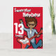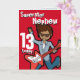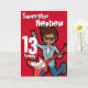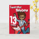 Cette carte a lu Superstar Nephew 13 aujourd'hui. À l'intérieur : Joyeux anniversaire ou vous pouvez customiser avec vos propres mots. Amusant garçon aux cheveux foncés rouge jouant sa carte de guitare électrique avec l'art original et conçu par Sarah Trett pour www.mylittleeden.com