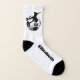 Ces amusantes chaussettes de football pour femmes présentent une joueuse de football silhouettée qui donne un coup de pied à un ballon de football surplombant un graphique de ballon de football - son numéro de maillot sur le ballon de football et son nom sont personnalisables - par katz_d_zynes