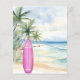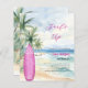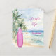 Une invitation pour une fête d'anniversaire de plage pour une fille. Plage de sable couleur eau, vagues de l'océan et palmiers en arrière - plan, planche de surf rose sur la plage. 1 feuille = 1 invite imprimé bord à bord.