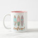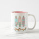 Cette tasse à café rétro, vintage, de plage offre des vibes estivales ! Il comporte trois planches de surf colorées avec les mots "Surf up!" Profitez de votre café dans cette tasse amusante et allez directement en mode vacances! Conception imprimée sur les deux côtés de la tasse.