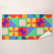 Ce kit de serviettes est muni d'un linge doré, d'une serviette orange, et d'une serviette de bain avec un modèle Bauhaus de carrés aux formes étranges à l'intérieur, répétée à travers le design.