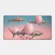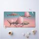 A surreal, pastel-toned paradox where strength drifts gently into softness. Sharks float effortlessly above a calm sea, lifted by delicate pink balloons, while blossoms obscure the figure below—turning instinct and danger into something quiet and dreamlike. The warm horizon and smooth retro palette create a sense of suspended time, where fear dissolves into curiosity and contrast becomes harmony. This artwork feels whimsical yet symbolic, blending irony, beauty, and imagination into a visually unforgettable scene that invites playful interpretation.