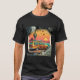 Cette œuvre d'art évocatrice mélange l'Amérique nostalgique avec la beauté naturelle et un cadre puissant et discordant. Un classique break "woody" jaune des années 1950, équipé d'un porte-surf et de planches, est garé sur une plage, son arrière face au spectateur. La plage est une étroite bande de sable au bord d'une mer vibrante d'un bleu impossible. De l'autre côté de l'eau, la scène se transforme en un paysage désertique spectaculaire au coucher du soleil, avec des buttes lointaines et escarpées et un cactus saguaro monumental se dressant contre un ciel enflammé. Le soleil est un orbe doré parfait près de l'horizon. Au-dessus, une volée d'oiseaux est figée en vol en silhouette. La scène entière est encapsulée dans un cadre de verre lourdement brisé et renforcé de fil de fer, qui s'est brisé pour créer une ouverture unique et irrégulière. Un vignette circulaire plus foncé à l'intérieur du verre met encore en valeur la voiture et le désert. Les bords du papier à l'intérieur du verre sont vieillis et texturés, ajoutant une atmosphère vintage. Le contraste entre le verre fragile