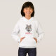 Le sweatshirt à capuchon de cette fille est montré en blanc. Manches longues, poches kangourous et style pull-over avec la phrase de "Yellowstone" écrite en écriture fantaisie en rouge et complétée par un graphique tête de loup. Customiser ou acheter tel quel.