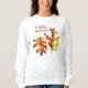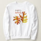 Feuilles d'automne sweatshirt avec une encre et l'aquarelle illustration représentant deux feuilles de chêne brun jaune pin et le texte Hello Automne. L'un des feuilles a un côté en cailloux qui ressemble à une main qu'il donne à son partenaire de danse.