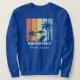 Personalized blue beach sweatshirt for your family trip to Hawaii, Florida, or other tropical island destinations. Cool palm trees sway against retro colors of orange and yellow above your customized vacation name in white script. Matching clothing is great for a group going on a cruise or coastal getaway.