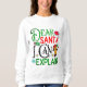 Ce drôle de t-shirt de Noël présente un design ludique avec des couleurs vives et des éléments festifs. L'expression Cher Père Noël, I Can Explain est présentée de manière très visible, ainsi que des illustrations fantaisistes de feuilles saints, un flocon de neige et un joyeux homme en pain d'épice portant un chapeau de Père Noël.
