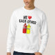 Contenants de Ketchup en moutarde drôle avec de mignons yeux de dessin animé et les mots, Nous nous aimons mutuellement. Quelle façon amusante de dire que nous nous aimons les uns les autres avec des chemises de couple assorties.