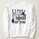 Ce design classique d'Halloween comporte l'expression éffrayante "Je mets un sort sur vous" dans une police audacieuse d'inspiration gothique. Les couleurs noir et blanc rehaussent l'atmosphère étrange, rendant le design parfait pour la saison d'Halloween. Le texte est accompagné d'éléments de sorcellerie iconiques, dont un casquette de sorcière pointu, un bâton de brosse, une toile d'araignée et une minuscule araignée, tous arrangés pour créer une composition de sorcière. Le détail subtil des points autour du texte ajoute une touche de charme magique.