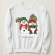 Un mignon gnome de Noël tout en rouge, vert et blanc tenant une tasse de chocolat chaud se tient à côté d'un bonhomme de neige avec un panneau Happy Holidays à côté d'eux portant une écharpe rouge et un casquette vert foncé.