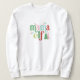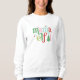 Ce sweatshirt ludique présente l'adage "elfe de maman" avec des couleurs alternées sur des lettres minuscules aux accents étincelants. Les couleurs sont rose, rouge, vert et bleu clair.