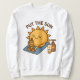 Un joyeux personnage de soleil se relaxant sur une serviette de plage avec de l'huile de bronzage et de la crème solaire, en profitant de l'atmosphère ultime été. Illustration ludique sur le thème de l'été alliant soleil, autosoins et douceur dans un design cosy.