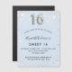 Une invitation à aimer moderne, élégante et glamour pour une soirée Sweet 16, 16e anniversaire de fille. Un arrière - plan bleu bébé, décoré de parties scintillant fausse argent, brille. Personnalisez et ajoutez votre nom et les détails de votre fête. Le numéro 16 est écrit avec une police de style ballon, script.