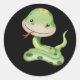 This cute sticker features a friendly, cartoon snake with a cheerful smile and a flicking red tongue. Its light green body is adorned with darker spots and yellow stripes, making it a fun and whimsical addition for any creative project.