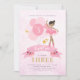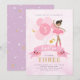 Invitation d'anniversaire à thème ballerine personnalisée en rose et or avec dos rose et violet étoilé. Avec ballerine dans un joli tutu rose, simulé des ailes dorées de citron et des ballons roses. Doux, girly, chic et élégant. Il est doté d'une conception avant et arrière. Personnaliser avec nom, âge et détails du parti. Options d'image Ballerina disponibles. Idéal pour ballet ou fée à thème.